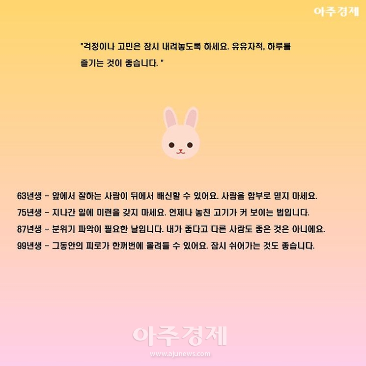 ▶토끼띠 오늘의 운세 "걱정이나 고민은 잠시 내려놓도록 하세요. 유유자적, 하루를 즐기는 것이 좋습니다. "