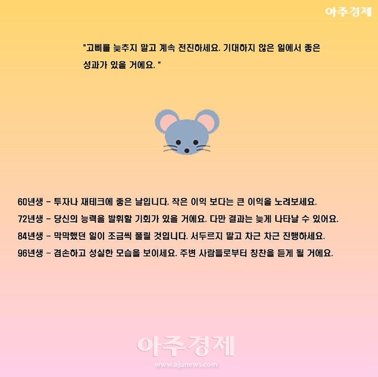 ▶쥐띠 오늘의 운세 "고삐를 늦추지 말고 계속 전진하세요. 기대하지 않은 일에서 좋은 성과가 있을 거에요. "