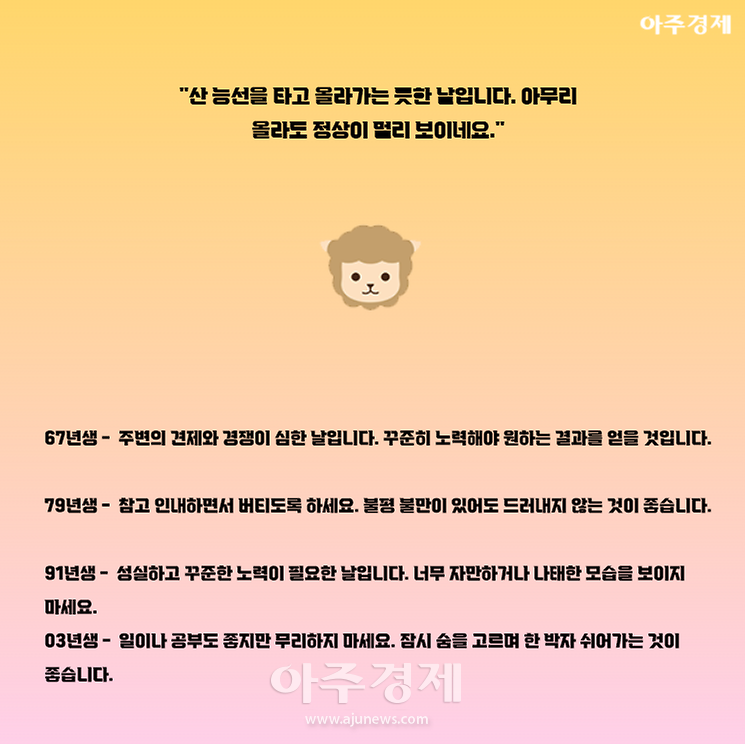 ▶양띠 오늘의 운세 "산 능선을 타고 올라가는 듯한 날입니다. 아무리 올라도 정상이 멀리 보이네요."