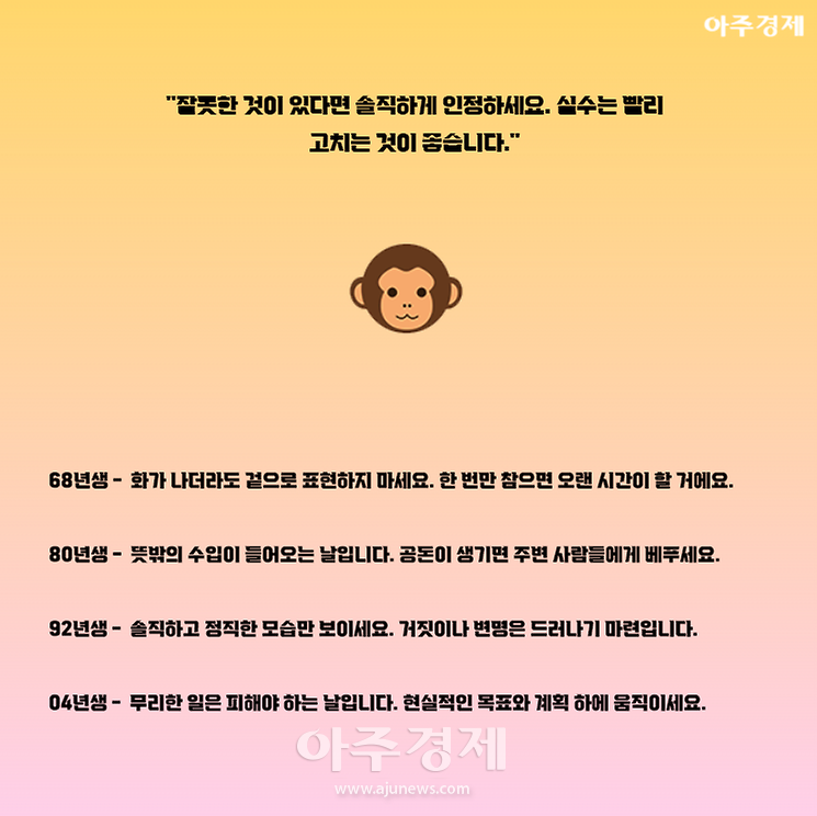 ▶원숭이띠 오늘의 운세 "잘못한 것이 있다면 솔직하게 인정하세요. 실수는 빨리 고치는 것이 좋습니다."