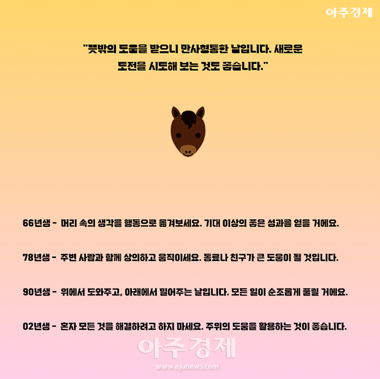 ▶말띠 오늘의 운세 "뜻밖의 도움을 받으니 만사형통한 날입니다. 새로운 도전을 시도해 보는 것도 좋습니다."