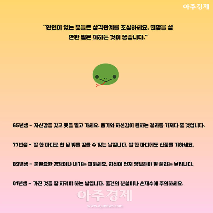 ▶뱀띠 오늘의 운세 "연인이 있는 분들은 삼각관계를 조심하세요. 원망을 살 만한 일은 피하는 것이 좋습니다."