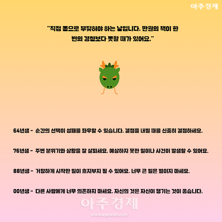 ▶용띠 오늘의 운세 "직접 몸으로 부딪혀야 하는 날입니다. 만권의 책이 한 번의 경험보다 못할 때가 있어요."