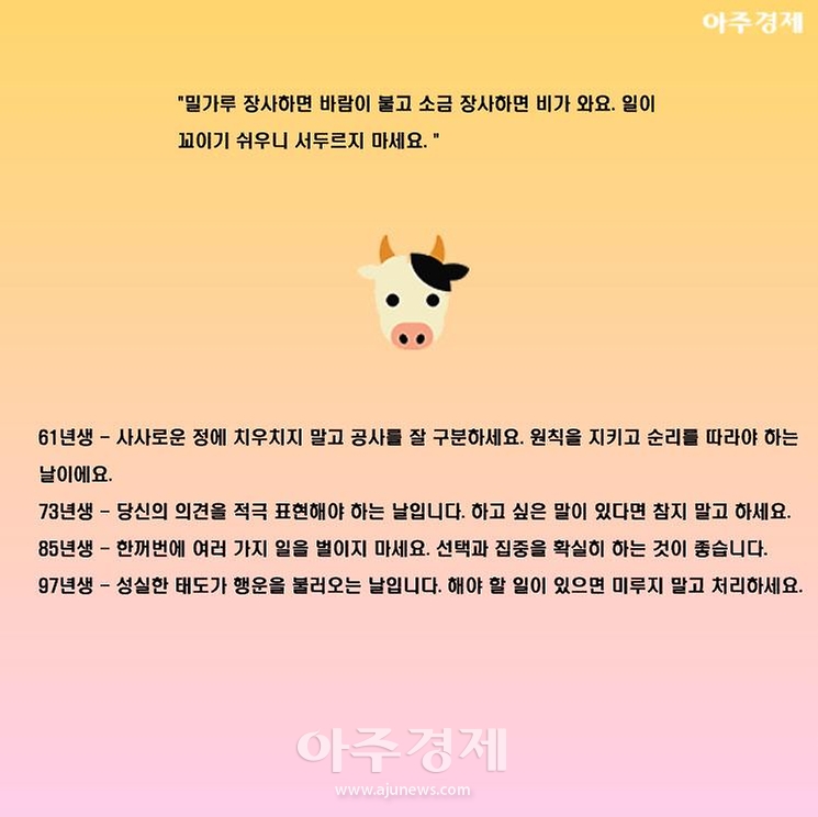 ▶소띠 오늘의 운세 "밀가루 장사하면 바람이 불고 소금 장사하면 비가 와요. 일이 꼬이기 쉬우니 서두르지 마세요. "