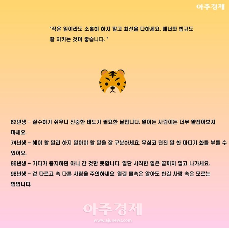 ▶호랑이띠 오늘의 운세 "작은 일이라도 소홀히 하지 말고 최선을 다하세요. 매너와 법규도 잘 지키는 것이 좋습니다. "