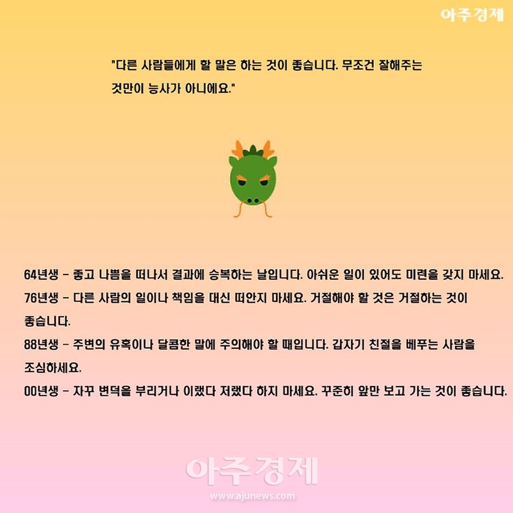 ▶용띠 오늘의 운세 "다른 사람들에게 할 말은 하는 것이 좋습니다. 무조건 잘해주는 것만이 능사가 아니에요."