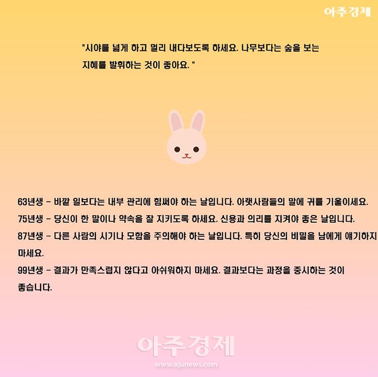 ▶토끼띠 오늘의 운세 "시야를 넓게 하고 멀리 내다보도록 하세요. 나무보다는 숲을 보는 지혜를 발휘하는 것이 좋아요. "