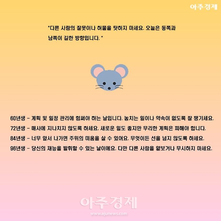 ▶쥐띠 오늘의 운세 "다른 사람의 잘못이나 허물을 탓하지 마세요. 오늘은 동쪽과 남쪽이 길한 방향입니다. "