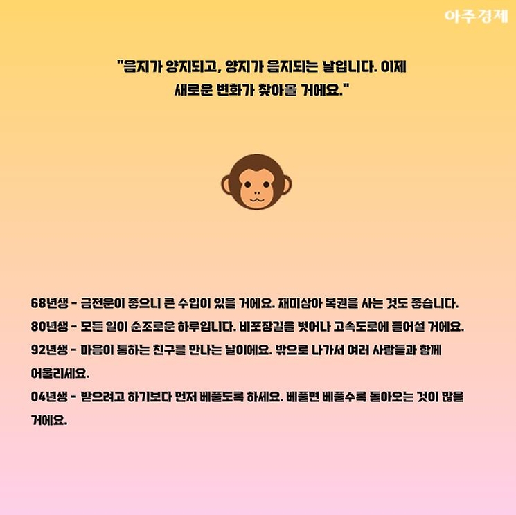 ▶원숭이띠 오늘의 운세 "음지가 양지되고, 양지가 음지되는 날입니다. 이제 새로운 변화가 찾아올 거에요."