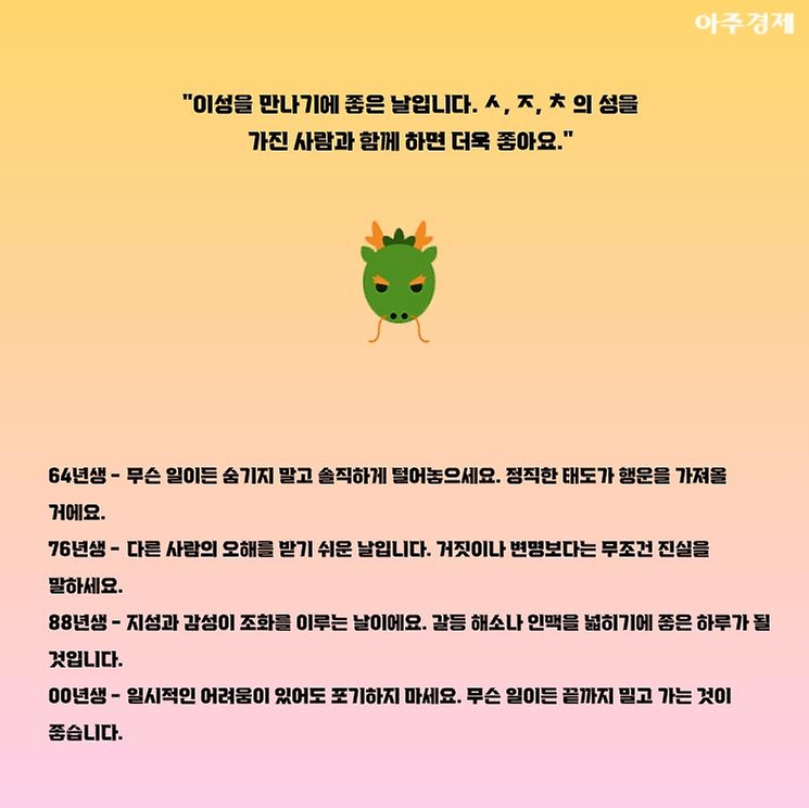 ▶용띠 오늘의 운세 "이성을 만나기에 좋은 날입니다. ㅅ, ㅈ, ㅊ 의 성을 가진 사람과 함께 하면 더욱 좋아요."