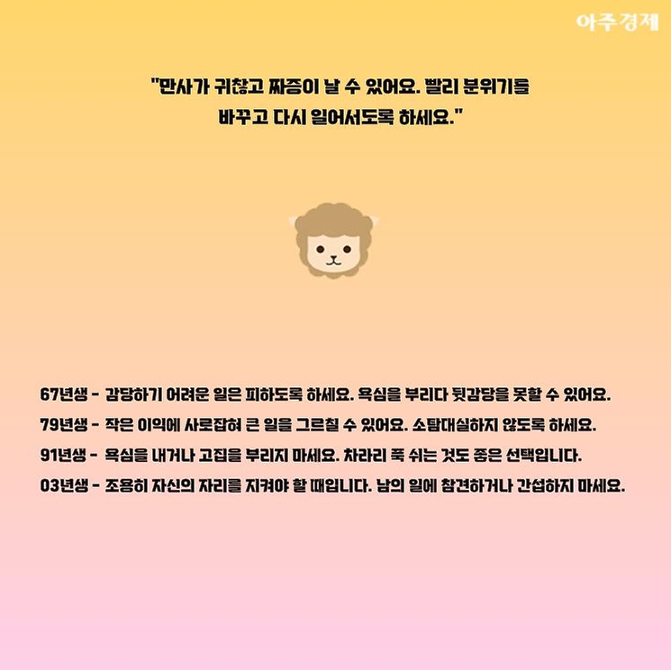 ▶양띠 오늘의 운세 "만사가 귀찮고 짜증이 날 수 있어요. 빨리 분위기를 바꾸고 다시 일어서도록 하세요."