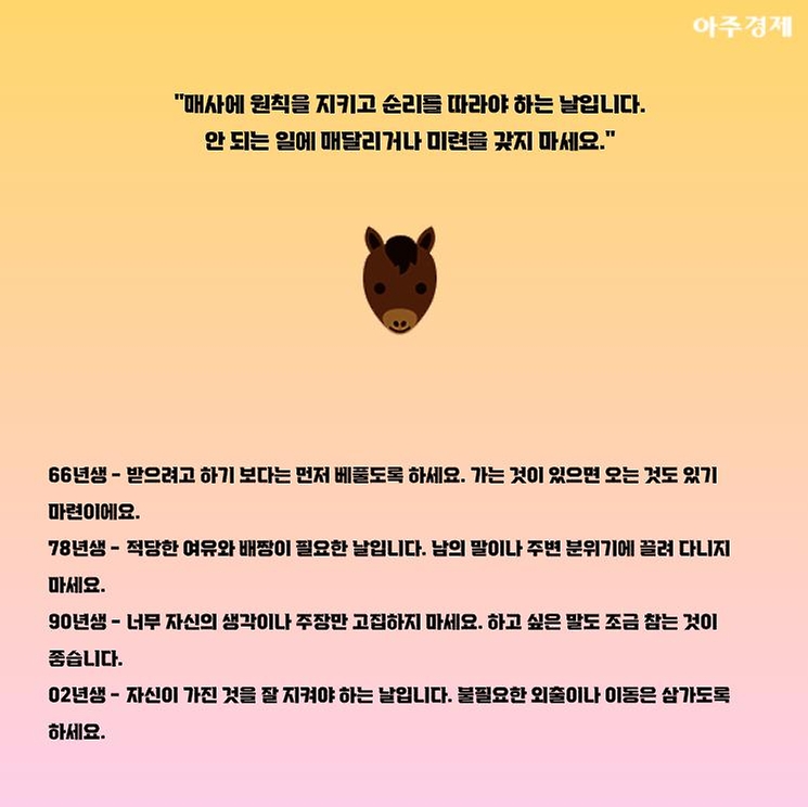 ▶말띠 오늘의 운세 "매사에 원칙을 지키고 순리를 따라야 하는 날입니다. 안 되는 일에 매달리거나 미련을 갖지 마세요."