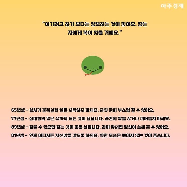 ▶뱀띠 오늘의 운세 "이기려고 하기 보다는 양보하는 것이 좋아요. 참는 자에게 복이 있을 거에요."