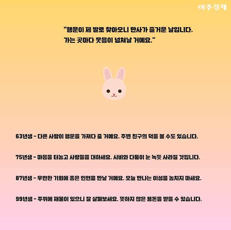 ▶토끼띠 오늘의 운세 "행운이 제 발로 찾아오니 만사가 즐거운 날입니다. 가는 곳마다 웃음이 넘쳐날 거에요. "
