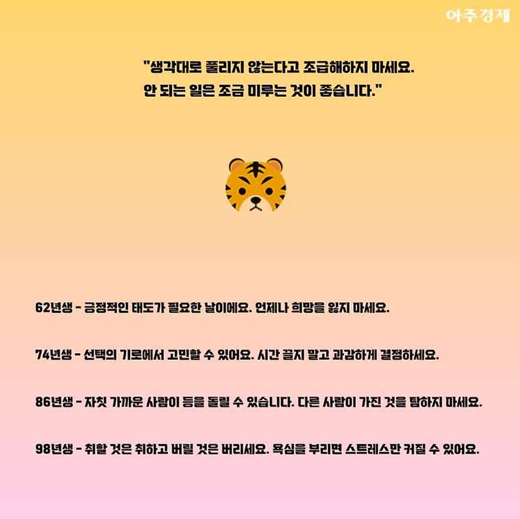 ▶호랑이띠 오늘의 운세 "생각대로 풀리지 않는다고 조급해하지 마세요. 안 되는 일은 조금 미루는 것이 좋습니다. "