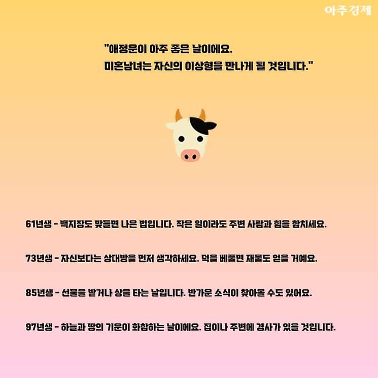 73년생 - 자신보다는 상대방을 먼저 생각하세요. 덕을 베풀면 친구도 생기고 재물도 얻을 거에요.