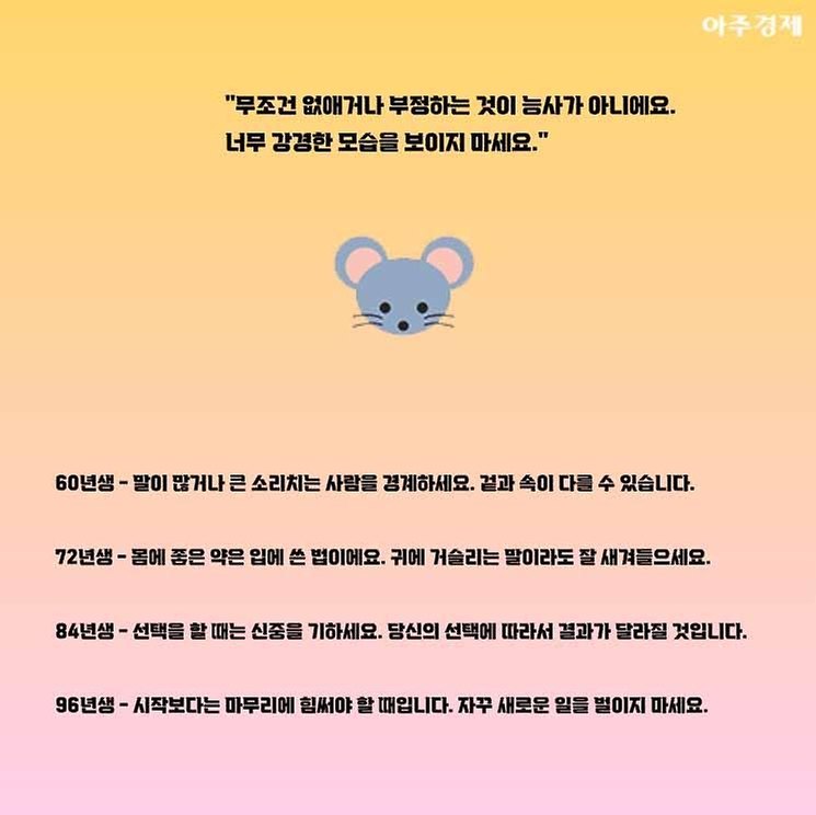 ▶쥐띠 오늘의 운세 "무조건 없애거나 부정하는 것이 능사가 아니에요. 너무 강경한 모습을 보이지 마세요. "