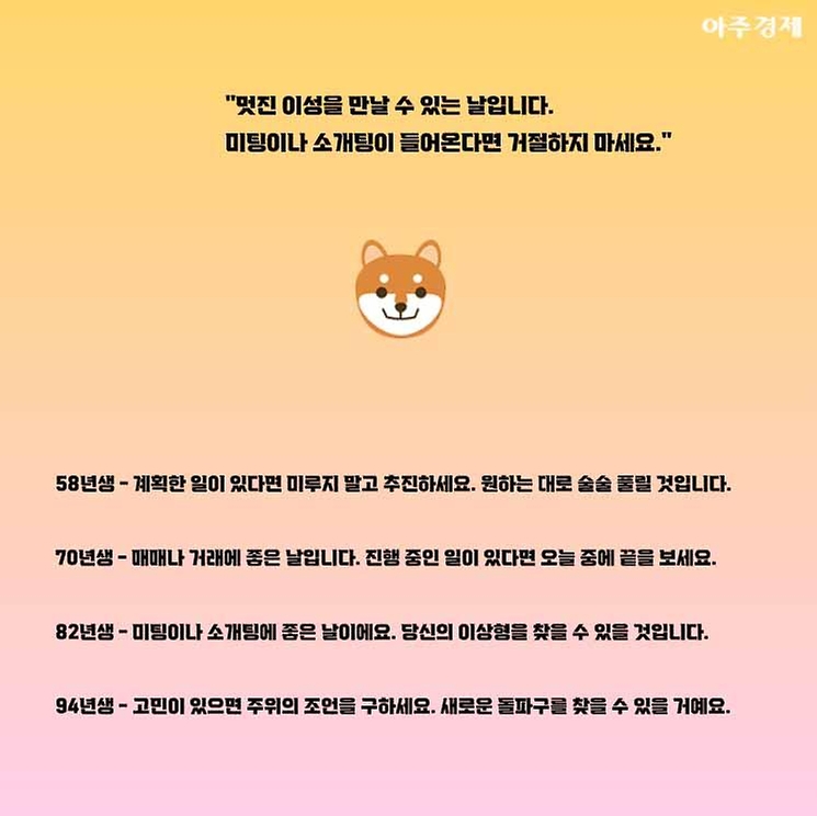 ▶개띠 오늘의 운세 "멋진 이성을 만날 수 있는 날입니다. 미팅이나 소개팅이 들어온다면 거절하지 마세요."