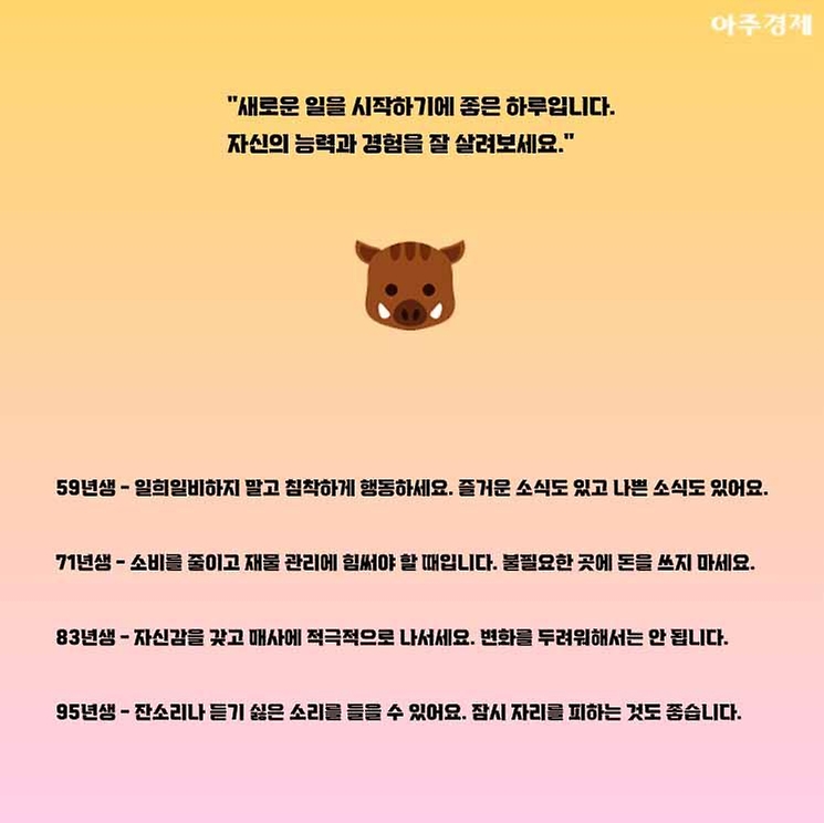 ▶돼지띠 오늘의 운세 "새로운 일을 시작하기에 좋은 하루입니다. 자신의 능력과 경험을 잘 살려보세요. "
