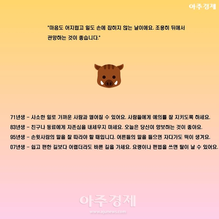 ▶돼지띠 오늘의 운세 "마음도 어지럽고 일도 손에 잡히지 않는 날이에요. 조용히 뒤에서 관망하는 것이 좋습니다."