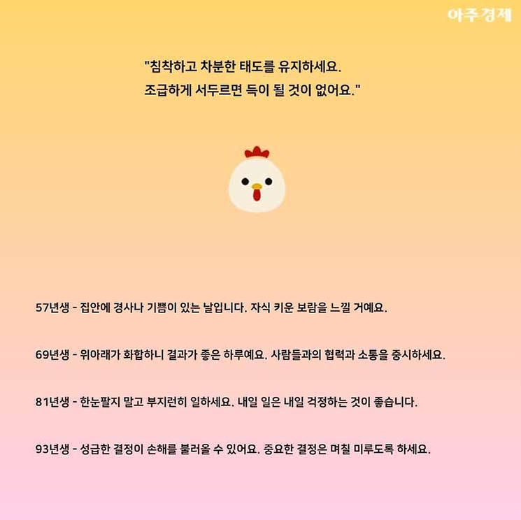 ▶닭띠 오늘의 운세 "침착하고 차분한 태도를 유지하세요. 조급하게 서두르면 득이 될 것이 없어요."