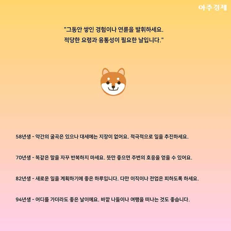 ▶개띠 오늘의 운세 "그동안 쌓인 경험이나 연륜을 발휘하세요. 적당한 요령과 융통성이 필요한 날입니다."