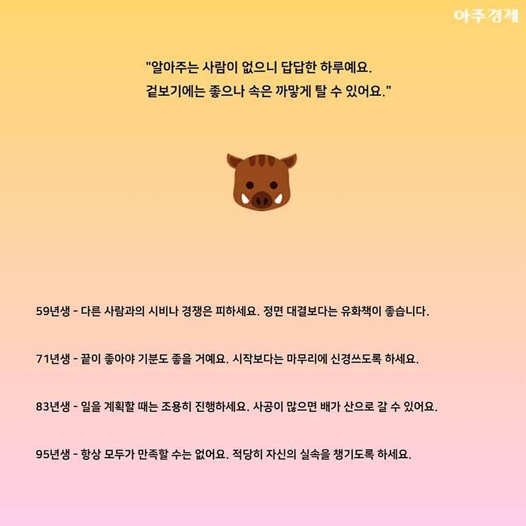 ▶돼지띠 오늘의 운세 "알아주는 사람이 없으니 답답한 하루예요. 겉보기에는 좋으나 속은 까맣게 탈 수 있어요."