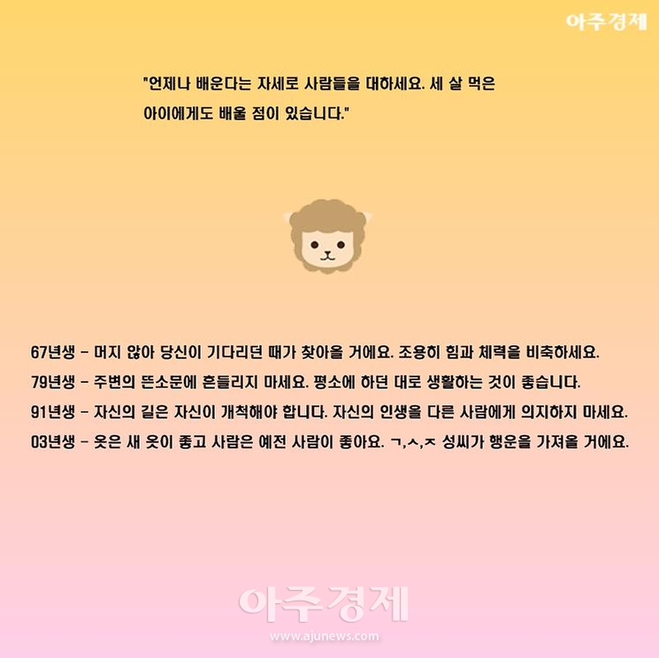 ▶양띠 오늘의 운세 "언제나 배운다는 자세로 사람들을 대하세요. 세 살 먹은 아이에게도 배울 점이 있습니다."