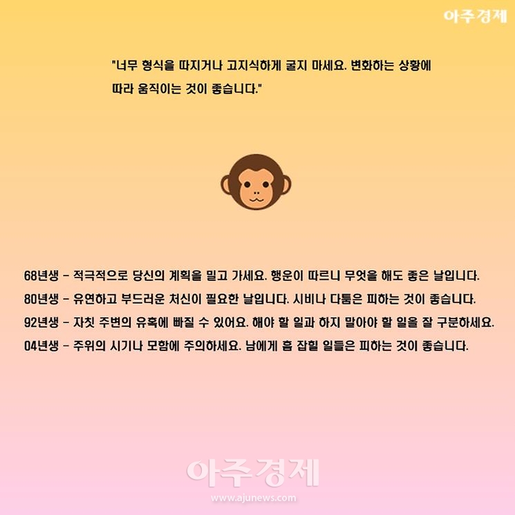 ▶원숭이띠 오늘의 운세 "너무 형식을 따지거나 고지식하게 굴지 마세요. 변화하는 상황에 따라 움직이는 것이 좋습니다."