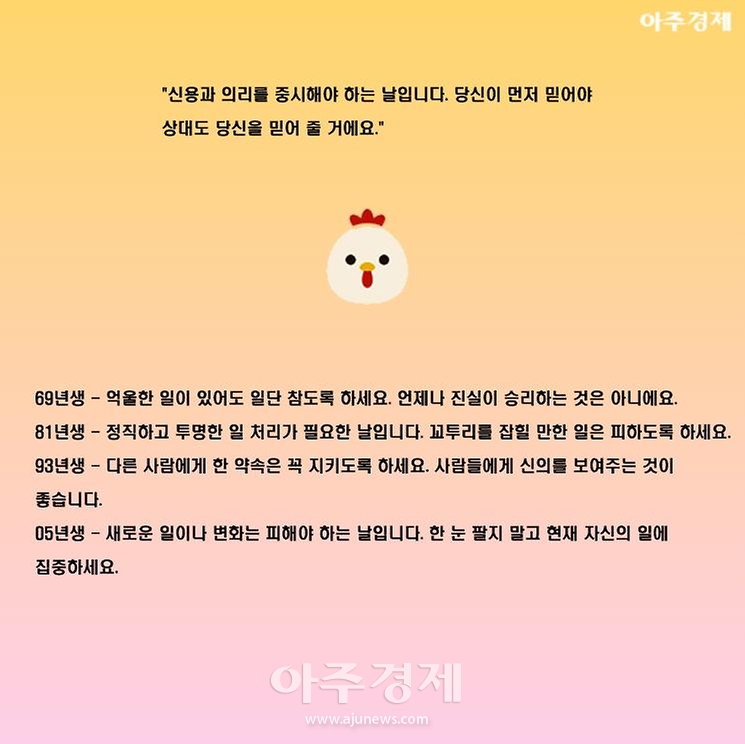 ▶닭띠 오늘의 운세 "신용과 의리를 중시해야 하는 날입니다. 당신이 먼저 믿어야 상대도 당신을 믿어 줄 거에요."