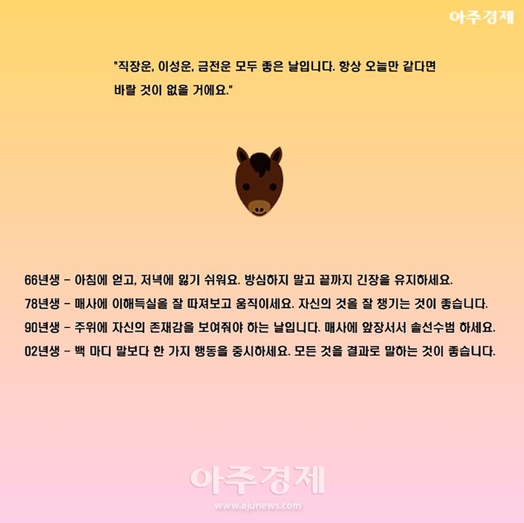 ▶말띠 오늘의 운세 "직장운, 이성운, 금전운 모두 좋은 날입니다. 항상 오늘만 같다면 바랄 것이 없을 거에요."