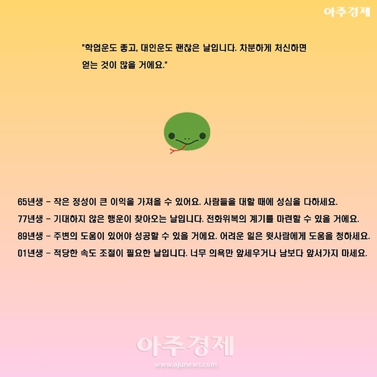 ▶뱀띠 오늘의 운세  "학업운도 좋고, 대인운도 괜찮은 날입니다. 차분하게 처신하면 얻는 것이 많을 거에요."