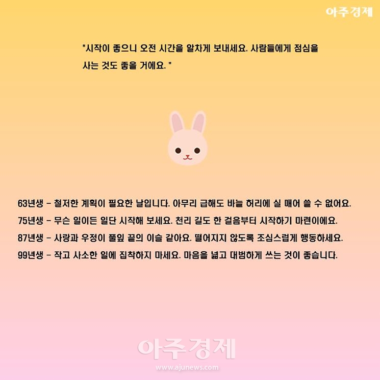 ▶토끼띠 오늘의 운세 "새로운 도전과 시도가 필요한 날입니다. 평소 관심있던 취미 생활을 해보는 것도 좋아요. "