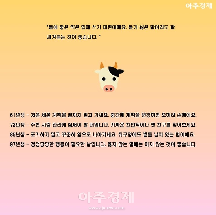 ▶소띠 오늘의 운세 "기름진 음식은 피하고 소식(小食)하는 것이 좋습니다. 오전 10시,오후 5시~7시가 행운의 시간입니다. "