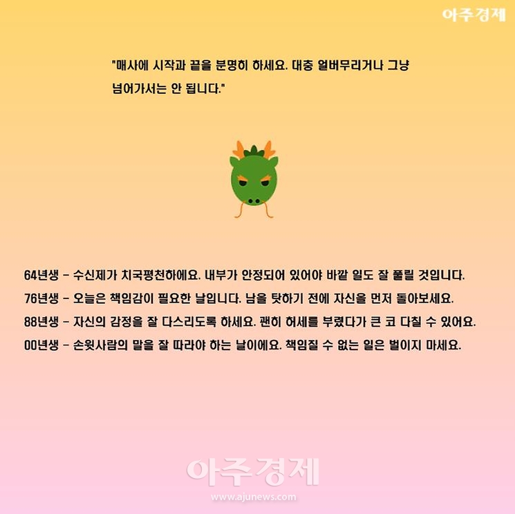 ▶용띠 오늘의 운세 "자신이 베풀었던 것만큼 돌아오는 날이에요. 콩심은 데 콩나고, 팥심은 데 팥이 날 것입니다."