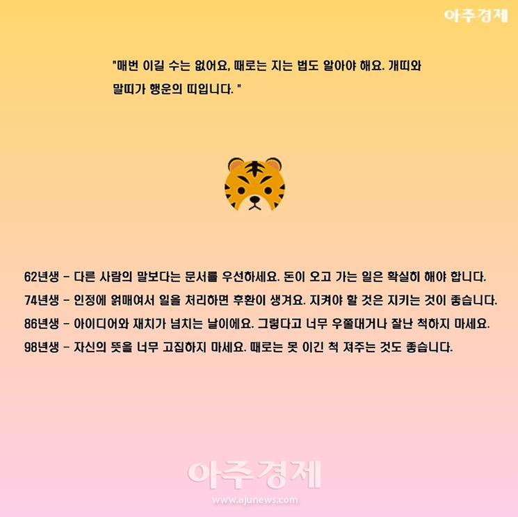▶호랑이띠 오늘의 운세 "앞집 처녀 믿다가 장가 못 갈 수 있어요. 다른 사람에게 의지하지 말고, 직접 발로 뛰세요. "