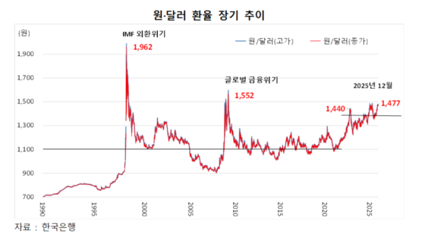 경험해 보지 못한 환율이다. 역사적으로 원·달러 환율 평균치는 1100원 수준이었다. 2025년 들어 평균 환율이 1400원 수준으로 올라선 모습이다. 과거 IMF 외환위기나 글로벌 금융위기 당시 일시적으로 원화 가치가 급락하고, 다시 평균 환율로 돌아갔던 모습과도 상당히 다르다. 점진적으로 환율이 올라서 1450원 선에서 맴도는 모습이다. 특히 1400원 수준의 고환율이 장기화한 경우는 역사상 처음 있는 일이다. ‘고환율 장기화 현상’이 한국 경제에 어떤 영향을 가져다줄지 진단하고 대응책을 모색할 시점이다.