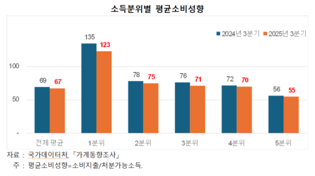 사실 같은 물가 상승 압력에도 그 부담은 저소득층에게 더 가중된다. 저소득층일수록 평균소비성향이 높기 때문이다. 평균소비성향은 한 가구가 벌어들인 소득 중에서 얼마만큼을 소비지출 하는지를 나타내는 지표다. 즉 처분가능소득에서 소비지출이 차지하는 비중으로 계산한다. 2025년 3분기를 기준으로 1분위 저소득층은 96만5000원의 처분가능소득으로 118만8000원의 소비지출을 하고, 5분위 고소득층은 776만9000원의 처분가능소득 중 426만2000원을 소비지출한다. 저소득층의 경우 부족한 소득으로 최소한의 생활을 영위하기 위해 부채에 의존하고 있다. 물가 상승은 삶의 질을 떨어뜨리거나 생계에 가혹한 부담으로 작용해 두렵기마저 하다. 반면 고소득층의 소비지출액이 저소득층보다 크지만 평균소비성향, 즉 소득 대비 비중은 작으므로 물가 상승이 딱히 부담스럽게 작용하지 않는다.