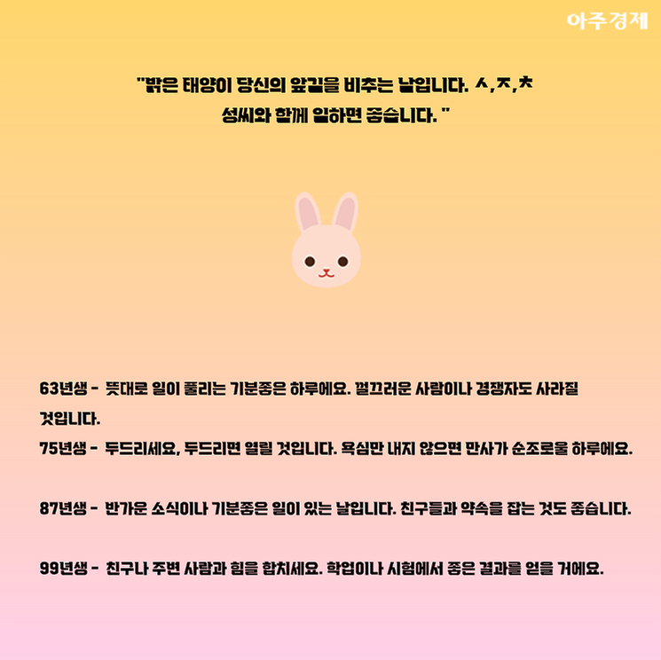 ▶토끼띠 오늘의 운세 "밝은 태양이 당신의 앞길을 비추는 날입니다. ㅅ,ㅈ,ㅊ 성씨와 함께 일하면 좋습니다. "