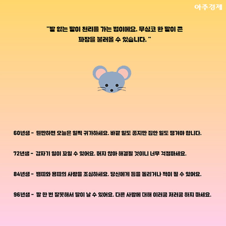 ▶쥐띠 오늘의 운세 "발 없는 말이 천리를 가는 법이에요. 무심코 한 말이 큰 파장을 불러올 수 있습니다. "
