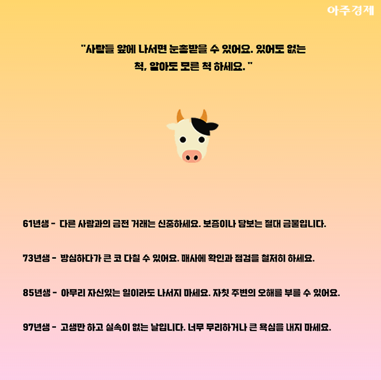 ▶소띠 오늘의 운세 "사람들 앞에 나서면 눈총받을 수 있어요. 있어도 없는 척, 알아도 모른 척 하세요. "