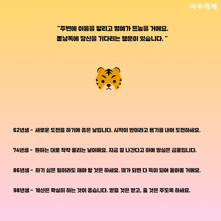 ▶호랑이띠 오늘의 운세 "주변에 이름을 알리고 명예가 드높을 거에요. 동남쪽에 당신을 기다리는 행운이 있습니다. "