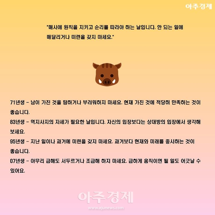 ▶돼지띠 오늘의 운세 "매사에 원칙을 지키고 순리를 따라야 하는 날입니다. 안 되는 일에 매달리거나 미련을 갖지 마세요."