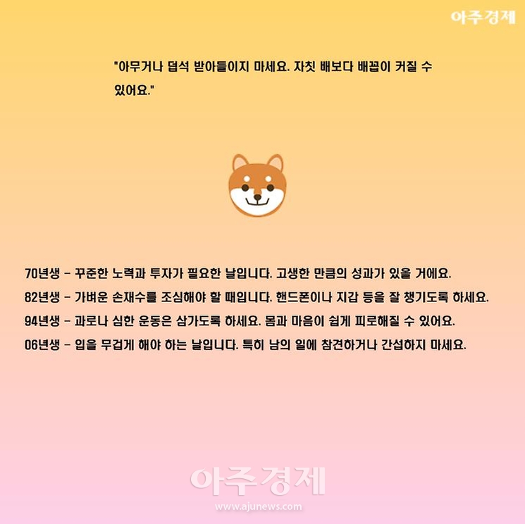 ▶개띠 오늘의 운세 "아무거나 덥석 받아들이지 마세요. 자칫 배보다 배꼽이 커질 수 있어요."