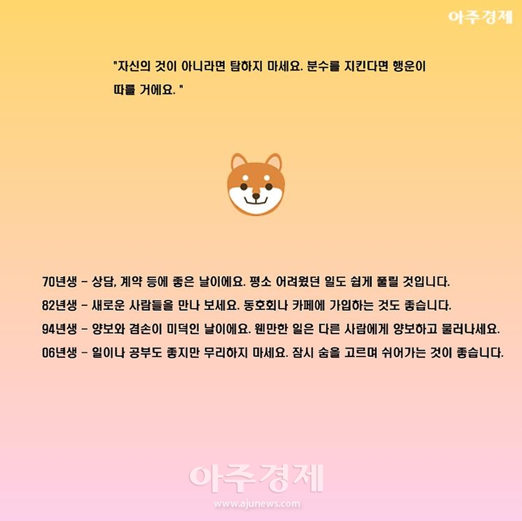▶개띠 오늘의 운세 "자신의 것이 아니라면 탐하지 마세요. 분수를 지킨다면 행운이 따를 거에요. "