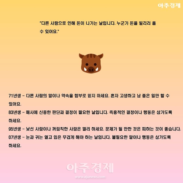 ▶돼지띠 오늘의 운세 "다른 사람으로 인해 돈이 나가는 날입니다. 누군가 돈을 빌리러 올 수 있어요."