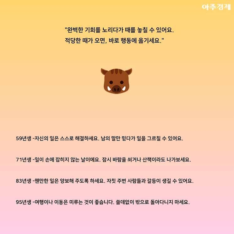 ▶돼지띠 오늘의 운세 "완벽한 기회를 노리다가 때를 놓칠 수 있어요. 적당한 때가 오면, 바로 행동에 옮기세요."