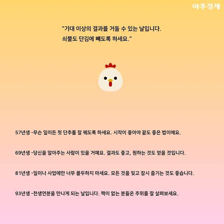 ▶닭띠 오늘의 운세 "기대 이상의 결과를 거둘 수 있는 날입니다. 쇠뿔도 단김에 빼도록 하세요."