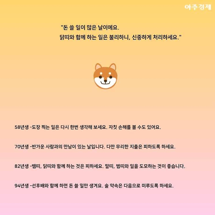 ▶개띠 오늘의 운세 "돈 쓸 일이 많은 날이에요. 닭띠와 함께 하는 일은 불리하니, 신중하게 처리하세요."