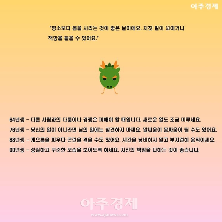 ▶용띠 오늘의 운세 "평소보다 몸을 사리는 것이 좋은 날이에요. 자칫 일이 꼬이거나 책망을 들을 수 있어요."